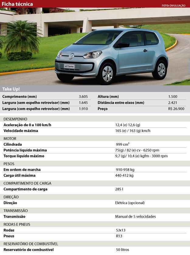 A Volkswagen lançou nesta quinta-feira a versão duas portas do compacto up! com foco no público jovem e frotistas. A carroceria é oferecida na versão de entrada Take up! por R$ 26.900 e na configuração seguinte Move up! por R$ 28.300. Outra novidade é o câmbio automatizado I-Motion, primeiro carro produzido no Brasil com motor 1.0 a oferecer essa opção.